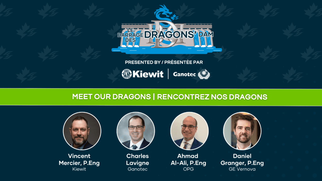 Les trois meilleures équipes présenteront leurs idées sur scène, mais pas devant n’importe quel public. Elles feront face aux dragons d’Hydroélectricité Canada, un panel de dirigeants réputés de l’industrie qui les évalueront, les remettront en question, et participeront enfin à la sélection des équipes gagnantes.
